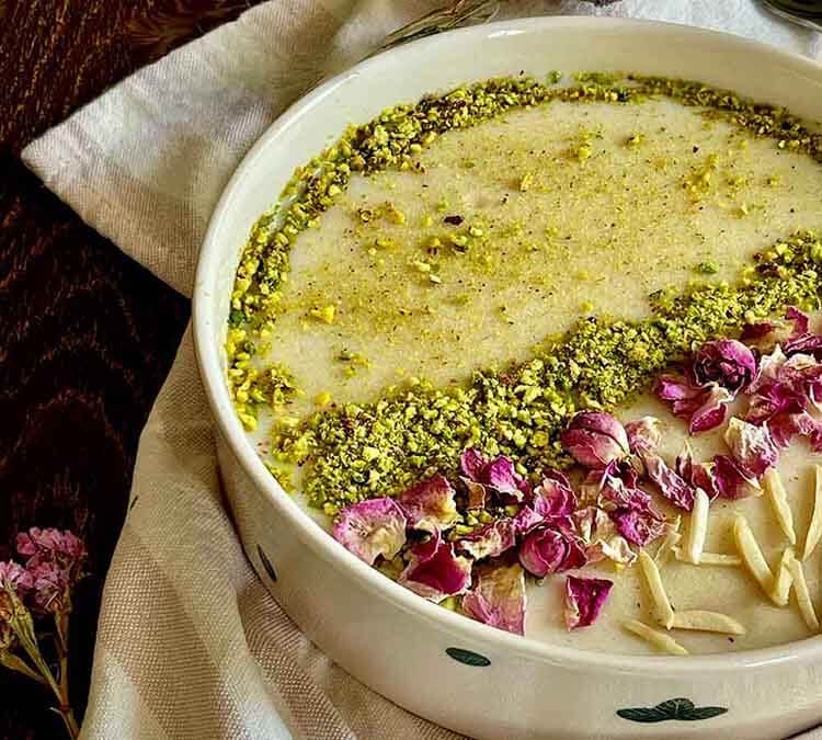 Pudding dessert decorated with pistachio and made with milk, cornstarch and sugar