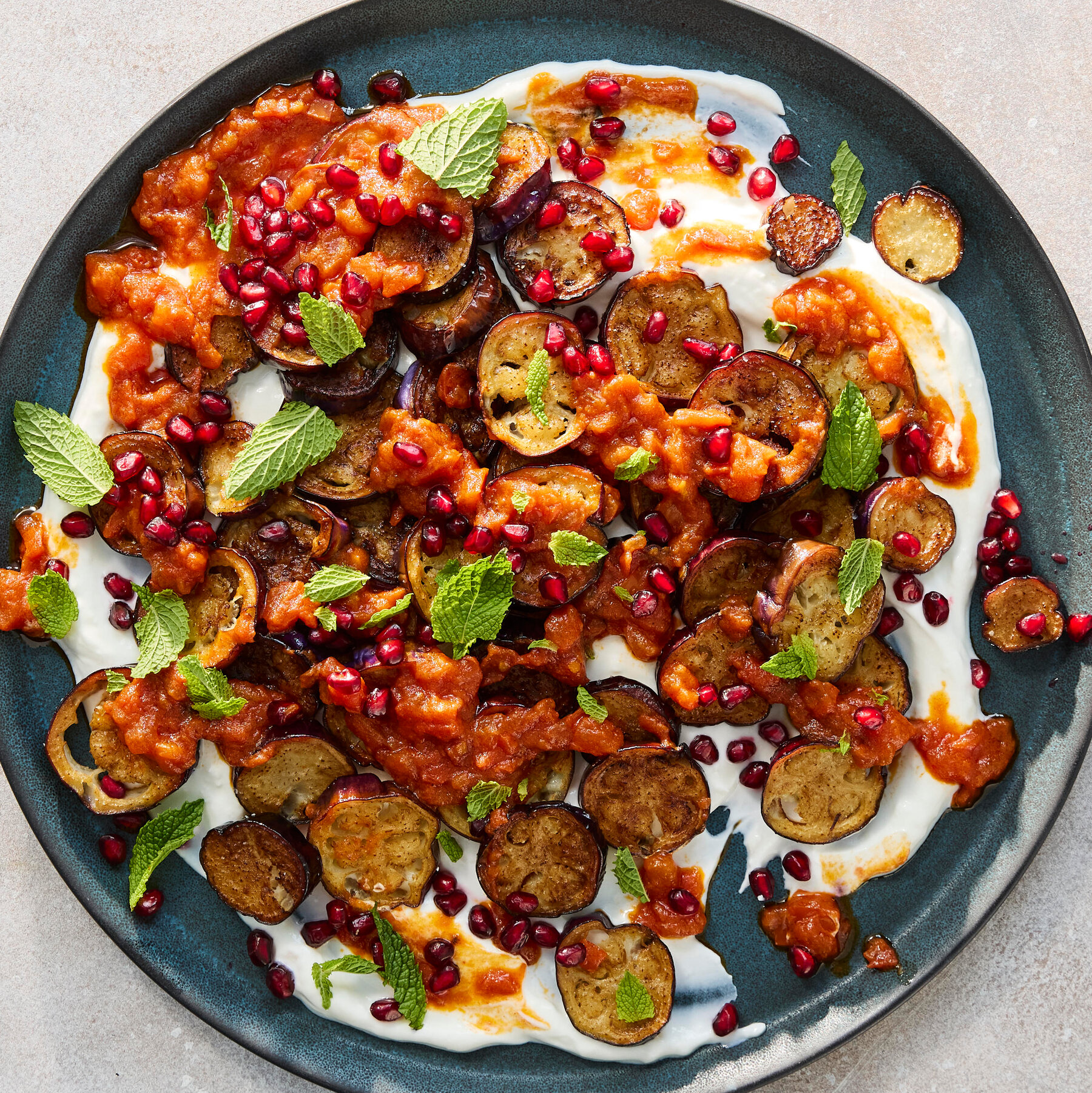 Roasted eggplant and bell peppers with yogurt sauce on top
